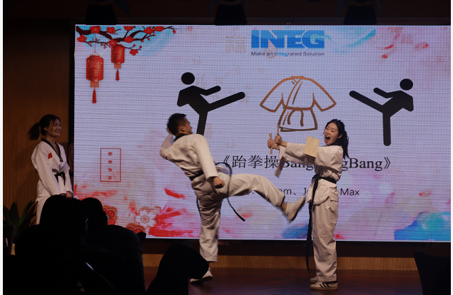 不得不說我們INTEG佳人們,太美了叭,怪不的說“城門外危難之間~英雄一怒為紅顏~就只看了你一眼,便決定了永遠~”下面有請倉庫部的Elvis給我們帶來一首好聽的歌曲《醉千年》 欣賞完了旗袍秀和歌曲想不想再來一個勁爆的節(jié)目。跆拳踢木板+跆拳舞BangBangBang